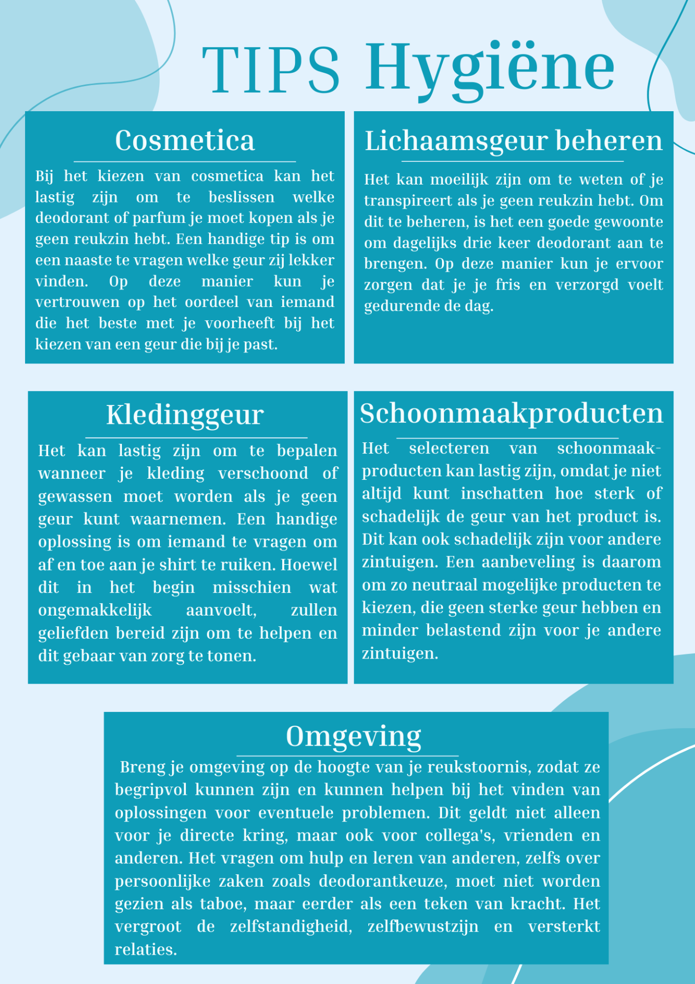 Ook in het dagelijks leven kan het hebben van een reukstoornis nieuwe problemen en moeilijkheden met zich meebrengen. Zo kan je bijvoorbeeld niet ruiken of je kleren nog fris zijn of wanneer je deo moet spuiten. Dit lijken vanzelfsprekende gewoontes die men vaak over het hoofd ziet, maar een grote impact hebben op de zelfstandigheid en onzekerheid van mensen met een reukstoornis. Geuren kunnen een belangrijke rol spelen in het vormen van onze identiteit. Denk maar aan het kiezen van een parfum, het gebruiken van lekker ruikende wasverzachter, het ruiken van een geliefde,... Het is ook niet altijd makkelijk om mensen aan te durven spreken aangezien dit als taboe gezien kan worden. Deze tips kunnen helpen om het dagelijkse leven zo aangenaam mogelijk te maken.